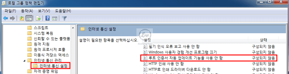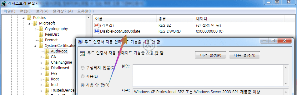 그리고 루트 인증서 자동 업데이트 기능을 사용 안 함 메뉴를 더블 클릭하자.