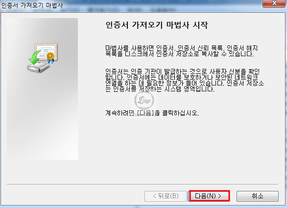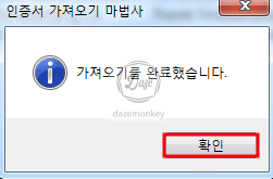 마침 버튼을 누르면 인증서를 제대로 가져오기 완료했습니다 메시지 창이 나타난다. 이런 방법으로 인증서 하나를 가져오기를 했으면 포털 사이트에 접속하여 제대로 뜨는지 확인해보자.