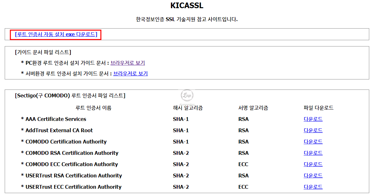 사이트에 접속해보면 인증서 자동 설치 프로그램, 수동으로 설치하는 가이드, 모든 인증서 파일 목록을 다운로드 할 수 있게 제공하고 있다.