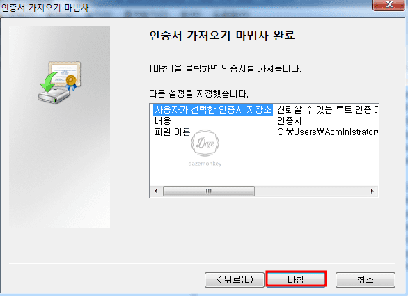 사용자가 선택한 인증서가 신뢰할 수 있는 루트 인증 기관에 저장했다는 메시지를 확인할 수 있다.