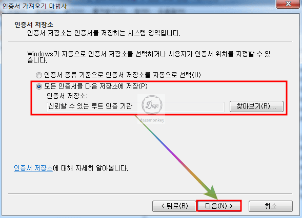 선택한 인증서를 신뢰할 수 있는 루트 인증 기관에 설치를 해야 하므로 모든 인증서를 다음 저장소에 저장 메뉴를 선택하고, 다음 버튼을 누른다.