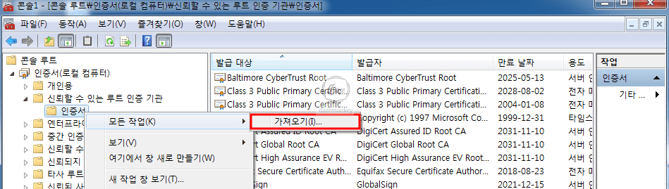 인증서 창이 나타나면 콘솔 루트 > 인증서(로컬 컴퓨터) > 신뢰할 수 있는 루트 인증 기관 > 인증서 순서로 이동한다. 그리고 인증서 메뉴에 마우스 우클릭 > 모든 작업 > 가져오기 메뉴를 클릭한다.