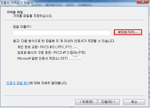 가져올 파일 화면이 나타나면 다운로드 받은 루트 인증서를 지정해야 하므로 찾아보기 버튼을 누른다.