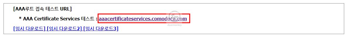 한국정보인증 SSL 기술지원 사이트 하단을 보면 AAA Certificate Services 테스트 사이트가 있는데, 이것을 클릭해보자.
