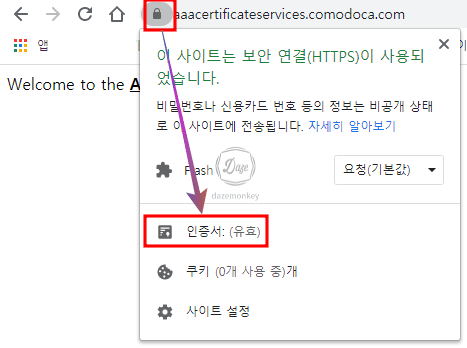 자물쇠 모양을 클릭하면 이 사이트는 보안 연결(HTTPS)이 사용되었습니다. 메시지를 확인할 수 있다. 이 메시지만 보더라도 보안 인증서 요건에 갖춘 것이다.