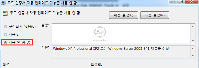 사용 안 함에 체크를 하면 루트 인증서를 자동으로 업데이트를 하는 것이고, 사용에 체크를 하면 자동으로 업데이트를 하지 않는 것이다.