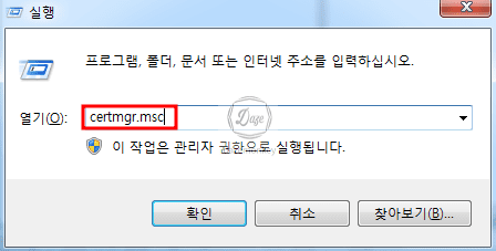 지난번 포스팅에서 윈도우 7 운영체제는 mmc 명령어를 입력하고, 윈도우 10 운영체제는 certlm.msc 명령어를 입력하라고 했다. 이제는 버전별 명령어를 입력하지 않고, certmgr.msc 명령어를 입력하자.