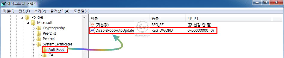 인증서 오류 탐색이 차단됨 (이 웹 사이트의 보안 인증서에 문제가 있습니다) 포스팅에서 첨부한 1번 파일을 더블 클릭하면 아래 그림과 같이 DisableRootAutoUpdate 값이 추가된다.