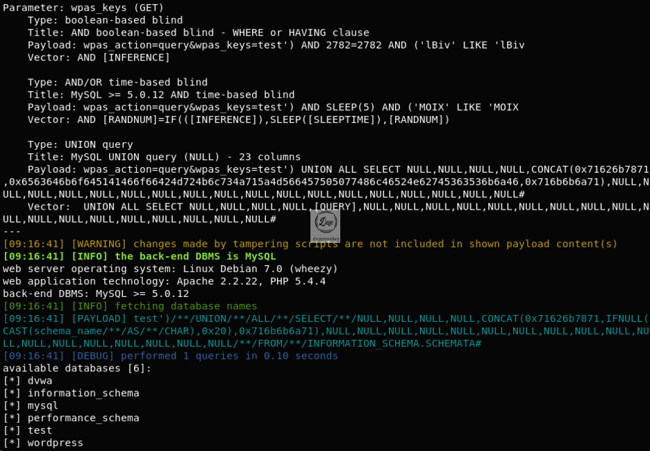 공백 문자를 치환하므로 공백 문자를 우회하는데 사용되는 공격 패턴(/**/)를 wpas_keys 변수에 주입하면 결과 값이 1개 출력된다.