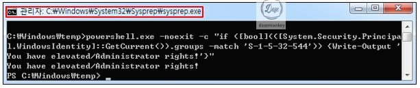 스크립트 실행이 완료되면 현재 로그인 중인 사용자가 소속된 그룹의 SID가 S-1-5-32-544(Administrators 그룹)와 일치하여 상승된 권한으로 쉘을 실행했다는 메시지가 출력된다.