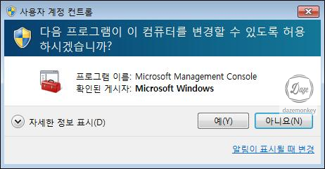 윈도우 운영체제에 관리자로 로그인 되어 있는 상태에서 컴퓨터 관리(compmgmt.msc)를 실행하려고 하면 사용자 계정 컨트롤이 실행되어 사용자에게 관리자 권한 상승을 요구한다.