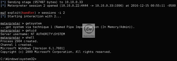 윈도우 7이 취약점 조건과 일치하므로 실질적인 공격을 수행하는 페이로드(Stages)를 전송한다. 페이로드가 실행되면 메타프리터 쉘의 세션이 열린다.