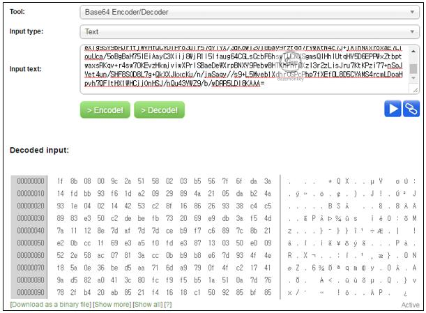 하지만, 디코딩 된 문자열을 보면 알 수 없는 문자열이므로 하단의 Download as a binary file 버튼을 클릭하여 바이너리 파일로 저장한다.