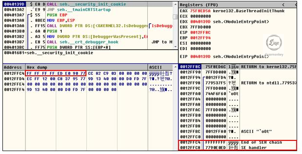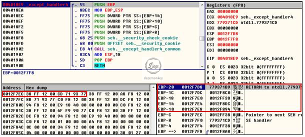 RETN까지 실행한 상태에서 덤프창을 보면 FS:[0] 세그먼트 레지스터는 0x0012FF78을 가리키고 있다. 이런식으로 하나씩 디버깅을 해보면 다른 SEH를 해제하는 것도 확인할 수 있다.