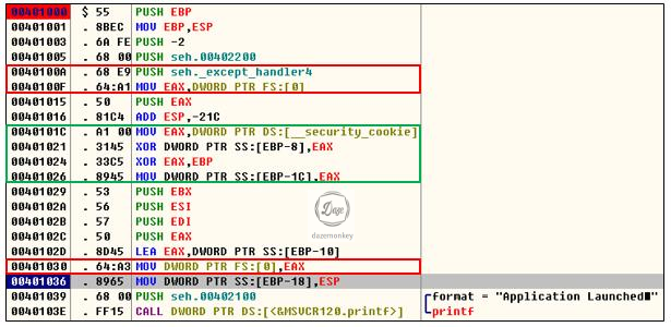 0x401005, 0x40100A, 0x401030 주소의 코드가 실행되면 기존에 설치 된 SEH 체인에 또 다른 예외 처리기가 추가된다. 이 예외 처리기는 프로그램에서 작성한 _try, _except 코드이다.