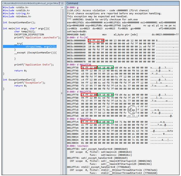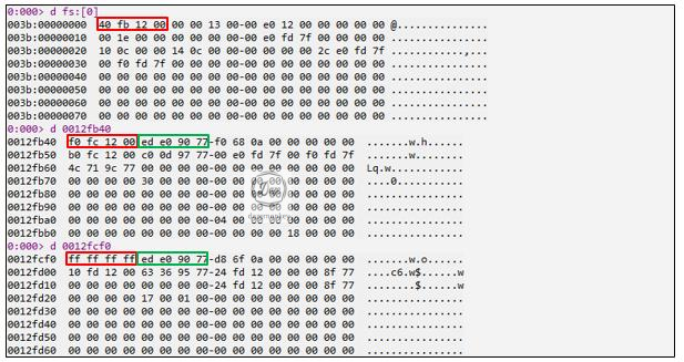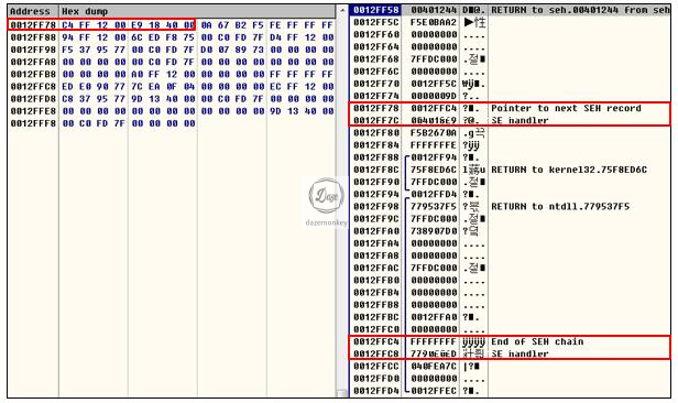 프로그램에서 작성한 예외 처리기가 기존 SEH 체인에 추가되어 SEH 체인의 시작 주소가 0x12FF38로 변경되었다. 운영체제에서 기본적으로 등록 된 예외 처리기를 포함해서 총 3개의 예외 처리기가 등록되었다.