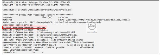 0x40107A, 0x4018E9(예외 처리기)에 브레이크 포인트를 설정하고, 예외를 디버기(seh.exe)에게 돌려주기 위해 Shift+F8를 누르고, F9를 눌러 실행한다.