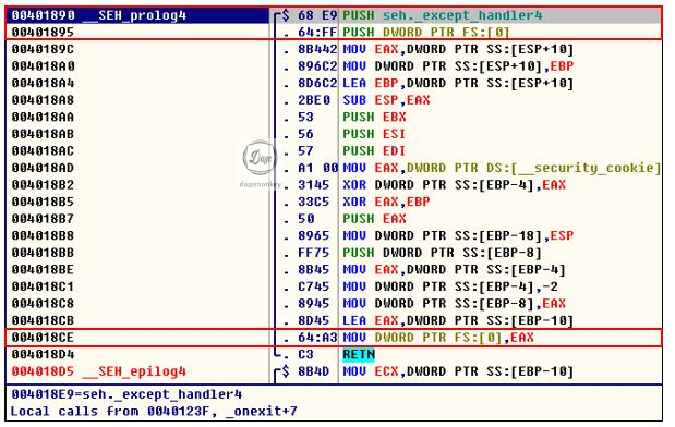 0x401890, 0x401895, 0x4018CE 주소의 코드가 실행되면 기존에 설치 된 SEH 체인에 또 다른 예외 처리기가 추가된다. 즉, EXCEPTION_REGISTRATION_RECORD 구조체에 자신의 EXCEPTION_REGISTRATION_RECORD 구조체를 연결하는 것이다.