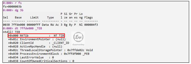 FS 세그먼트 레지스터는 사용자 영역(User Mode)의 TEB/TIB 정보를 가지고 있는 레지스터이다. FS 세그먼트 레지스터는 TEB의 시작 주소를 가리키고, TEB의 시작 주소는 TIB의 시작 주소를 가리킨다.