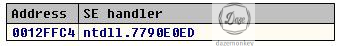 Next SEH는 0xFFFFFFFF이고, SEH Handler는 0x7790E0ED이다. 현 상황으로 볼 때, 프로그램을 실행하기도 전에 운영체제의 기본 SEH 핸들러가 등록된다.