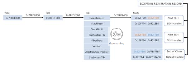 예외 발생 시 FS 세그먼트 레지스터를 참조하여 커널 영역의 TEB를 따라가지 않고, 스택에 형성된 SEH 체인을 참조하여 예외를 처리한다.