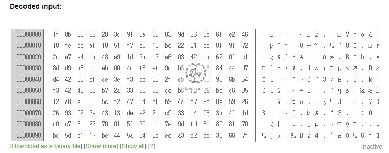 인코딩 되어 있는 코드를 디코딩하려면 Base64 디코딩을 하고, gzip 압축을 해재 해야 한다.