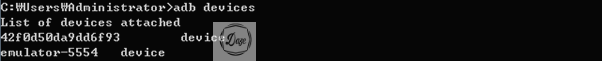 adb devices 명령어를 입력하면 PC에 연결된 단말기 정보를 확인할 수 있다. 42f0d50dad6f93은 실제 단말기이고, emulator-5554는 가상 단말기이다.