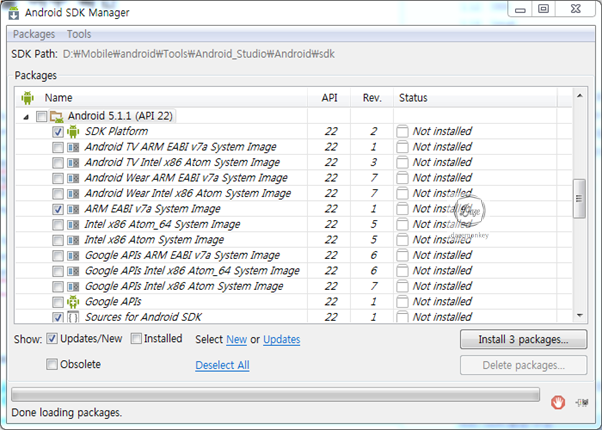 하단의 Show: Updates/New, Installed 항목에 체크되어 있는 것을 해제했다가 Updates/New 항목만 체크한다. Android 5.1.1 (API 22), Android 4.1.2 (API 16)를 다음과 같이 체크하고, Install packages 버튼을 눌러 설치한다.