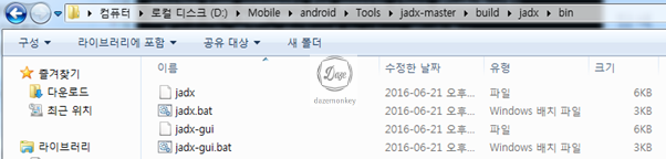 빌드가 모두 완료되면 build\jadx\bin 폴더에 커맨드 라인 환경의 도구와 GUI 도구가 빌드되어 생성된다.