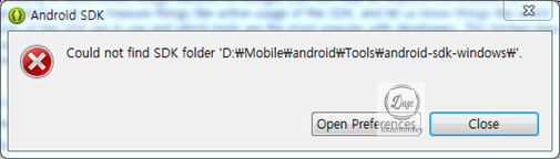 이클립스 ADT 버전을 실행하면 SDK 경로를 찾을 수 없다는 경고 메시지가 출력된다. Open Preferences 버튼을 클릭하여 안드로이드 스튜디오 설치 시 자동으로 설치된 SDK 경로를 지정하면 에러 메시지가 출력되지 않는다.
