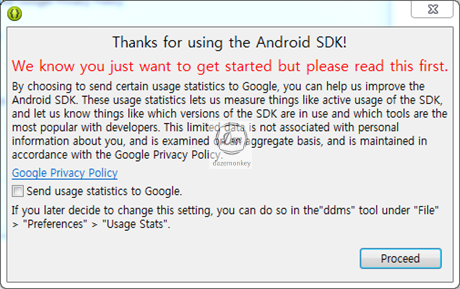 Send usage statistics to Google에 체크 박스를 해제하고, Proceed 버튼을 클릭한다.