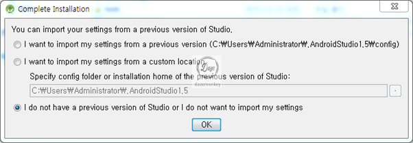 안드로이드 스튜디오를 실행하면 이전에 설정한 환경이 존재하는지 묻는 창이 출력된다. 현재 설치한 안드로이드 스튜디오는 깨끗한(Clean) 버전이므로 세 번째 라디오 박스에 체크한다.