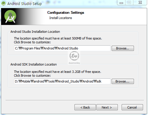 기본 디렉토리(C:\Users\Administrator\AppData\Local\Android\sdk)에 설치하면 C 드라이브 용량 부족 현상이 발생하게 되므로, 용량이 많은 드라이브로 변경하여 설치한다.