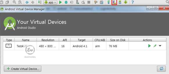 새로운 가상 단말기를 안드로이드 스튜디오에서 생성하고, 실행한다. 상단의 AVD Manager 아이콘을 클릭하면 가상 단말기를 생성, 삭제, 편집할 수 있는 화면이 출력된다.