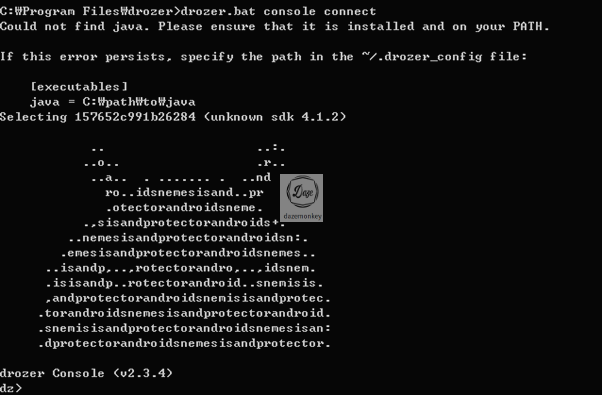 drozer 명령어를 이용해 단말기에 설치된 드로저 서버에 연결한다. 정상적으로 연결되면 하단의 명령어를 입력할 수 있는 새로운 프롬프트가 출력된다.