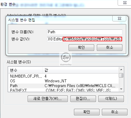 현재 위치에서 안드로이드 분석 도구를 실행하려면 환경 변수에 등록해야 한다. 현재 adb가 설치된 경로를 복사하여 시스템 환경 변수(PATH)에 붙여 넣기 한다.
