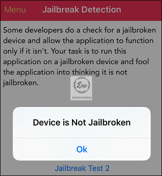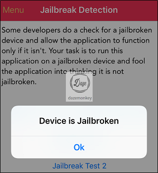 모바일 앱을 실행 후 Menu > Jailbreak Detection > Jailbreak Test 1 순서대로 누르면 탈옥된 단말기를 탐지하는 문구가 실행된다.