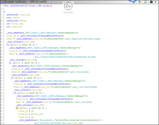 검색하면 JailbreakDetectionVC 클래스 내의 여러 개의 탈옥 탐지 함수가 보이는데, isJailbroken 함수를 클릭하면 해당 함수의 디컴파일 코드를 보여준다. 코드를 보면 탈옥 단말기에 존재하는 파일이 존재하면 '1'을 반환한다.