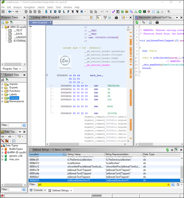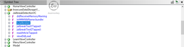 탈옥 탐지를 우회하려면 클래스, 메소드, 반환 값 순서대로 찾아야 한다. 탈옥된 단말기에서 앱을 실행하면 Jailbroken 문구가 출력되었으므로 Symbol Tree 창에서 키워드를 검색한다.