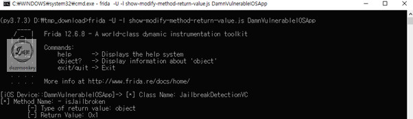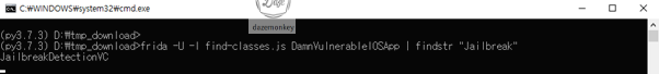 ○ frida -U -l frida-classes.js DamnVulnerableiOSApp | findstr "Jailbreak"