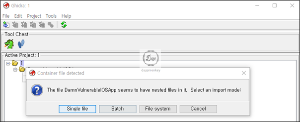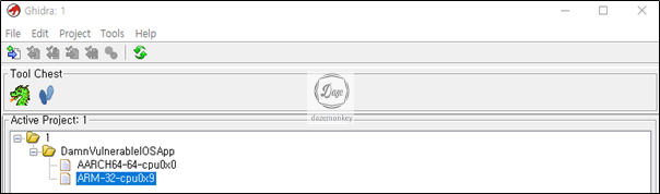 프로그램을 실행하면 현재 활성화 되어 있는 프로젝트 목록이 출력된다. 모바일 단말기에 설치된 바이너리 파일(DamnVulnerableIOSApp)을 프로젝트에 드래그하면 여러 개의 분석 옵션이 제공한다.
