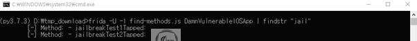 ○ frida -U -l find-methods.js DamnVulnerableiOSApp | findstr "jail"