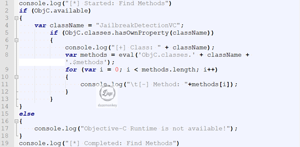 js 파일을 로드하면 JailbreakDetectionVC 클래스 내의 모든 메소드가 출력된다. jail 문자열을 필터링하면 - jailbreakTest1Tapped:, - jailbreakTest2Tapped:, - isJailbroken 메소드가 존재한다.
