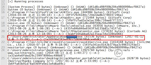 의심스로운 폴더에서 실행중인 파일 목록에 보면 전에 확인한 의심스러운 파일이 있다.