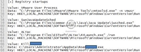 희생자는 갑자기 자신의 시스템 시작 레지스트리에 알 수 없는 파일이 등록되었고, 설치 된 백신이 동작은 하는데 트레이 아이콘이 뜨지 않는다고 전문가에게 의뢰한다.