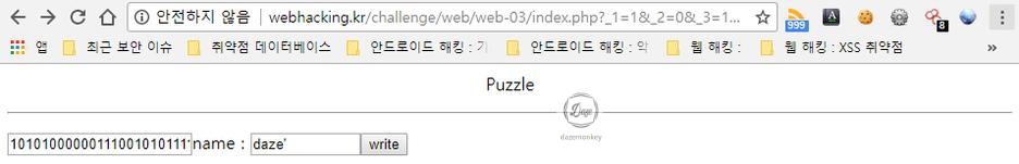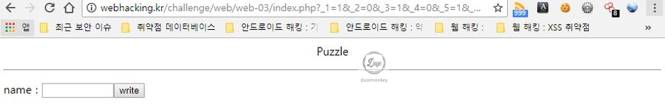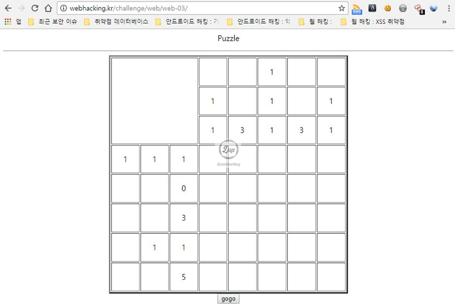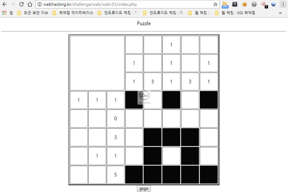 타일 한 개를 클릭 후 'gogo' 버튼을 클릭하면 'No' 메시지가 출력 후 퍼즐이 있는 페이지로 이동된다.