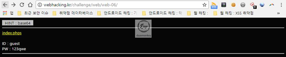 6번 문제를 클릭하면 계정 정보, index.phps 링크가 존재한다. 또한, 문제를 해결하기 위해 base64 인코딩 및 디코딩 힌트가 주어진다.